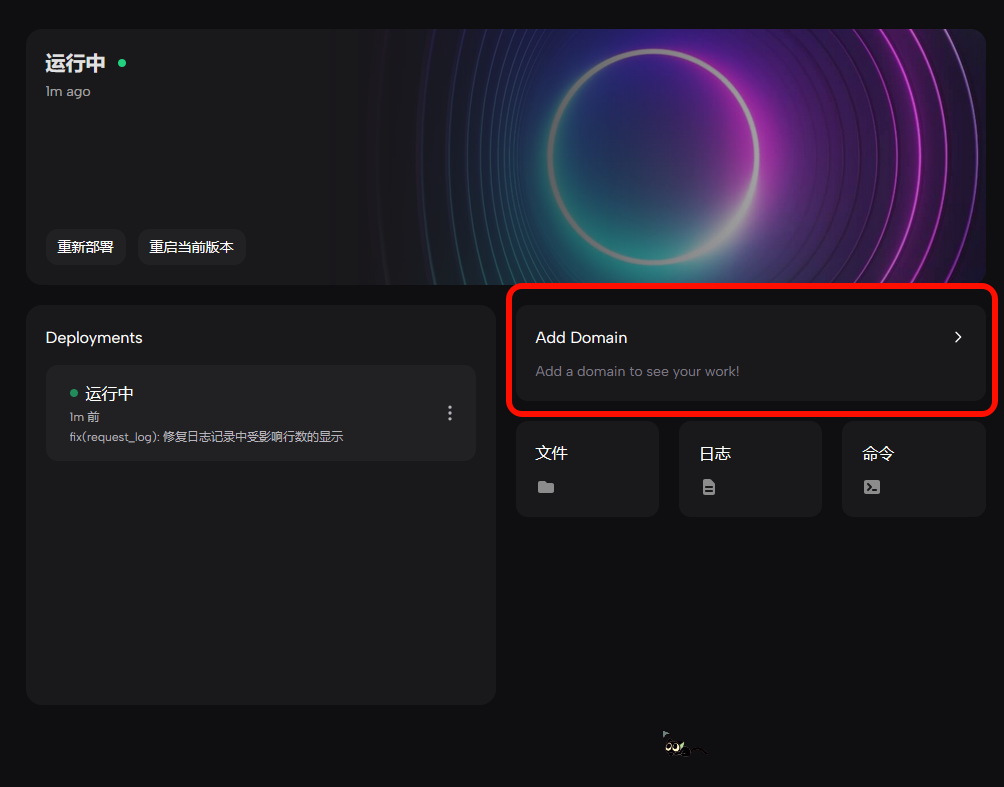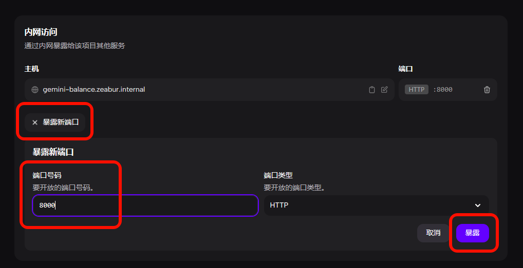 5. 随后会跳转到当前部署项目的主页,打开Add Domain之后,再选择暴露新的端口,随后填写8000后选择暴露,系统自动给到的8080端口可以选择删除,不影响