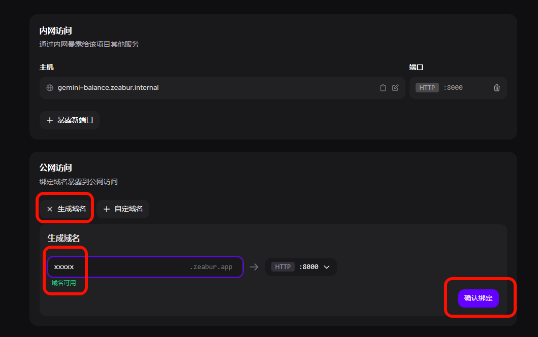 6. 选择生成域名,填入一个你喜欢的域名且显示域名可用后选择确认绑定即可,等待域名变绿后即可前往使用