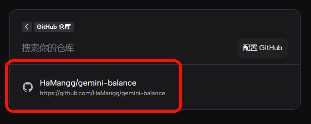 3. 选择Github后再选择你fork下来的gemini balance仓库,如果没有的话就先点 配置Github
