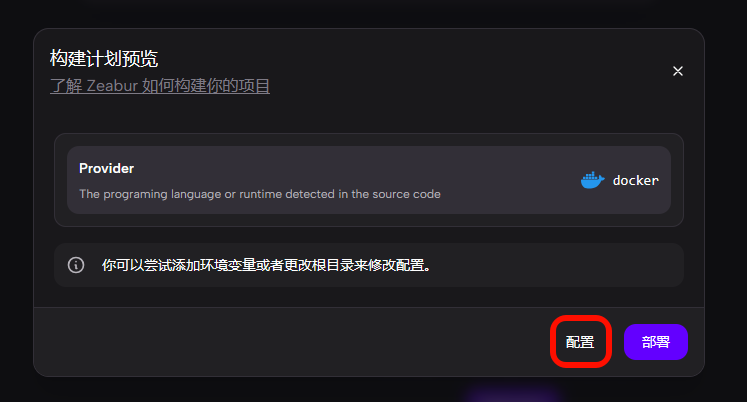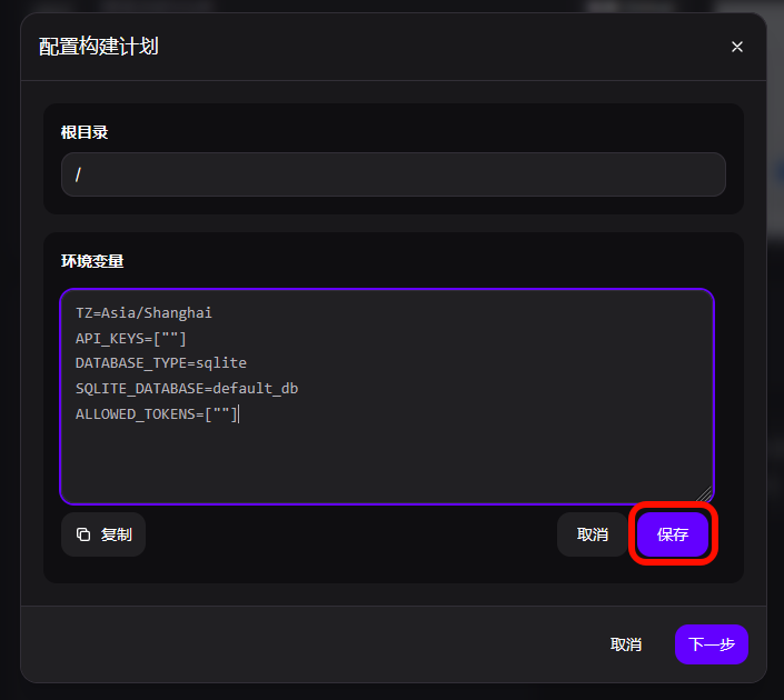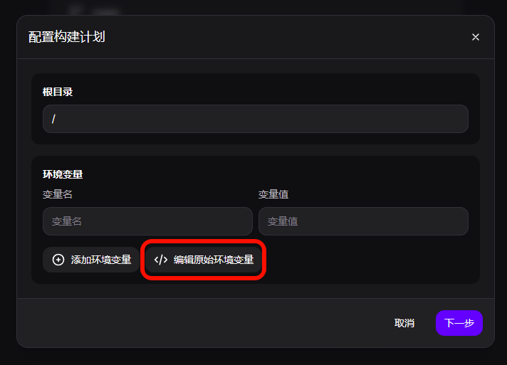 4. 在构建计划预览中点配置-编辑原始环境变量把以下代码完整替换其中的内容,最后再依次保存-下一步即可
